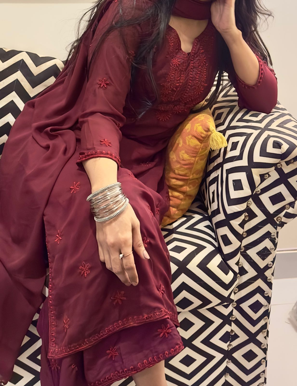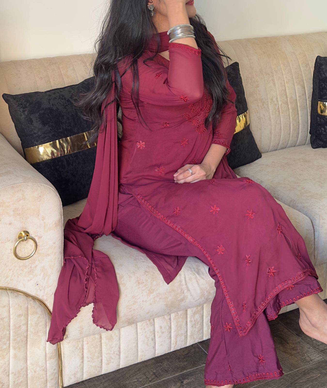 The Indian 3pc ๐‚๐ก๐ข๐Ÿ๐Ÿ๐จ๐ง ๐‹๐ฎ๐œ๐ค๐ง๐จ๐ฐ๐ข ๐ค๐ฎ๐ซ๐ญ๐ข Set is with Same Shade ๐‚๐ก๐ข๐ค๐š๐ง๐ค๐š๐ซ๐ข ๐ž๐ฆ๐›๐ซ๐จ๐ข๐๐ž๐ซ๐ฒ throughout the shirt, complemented by beautiful borders on Side Seams, Daman and sleeves.