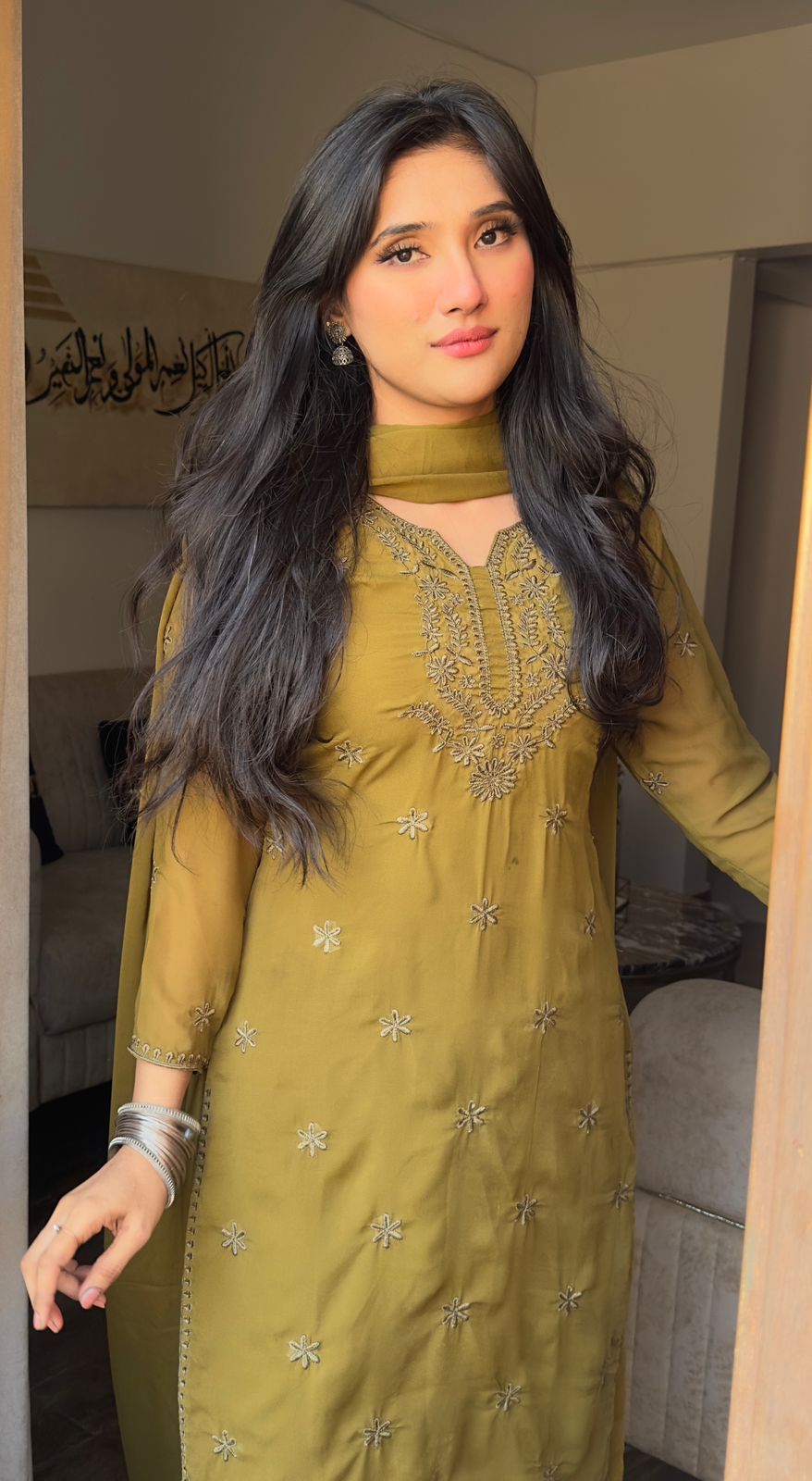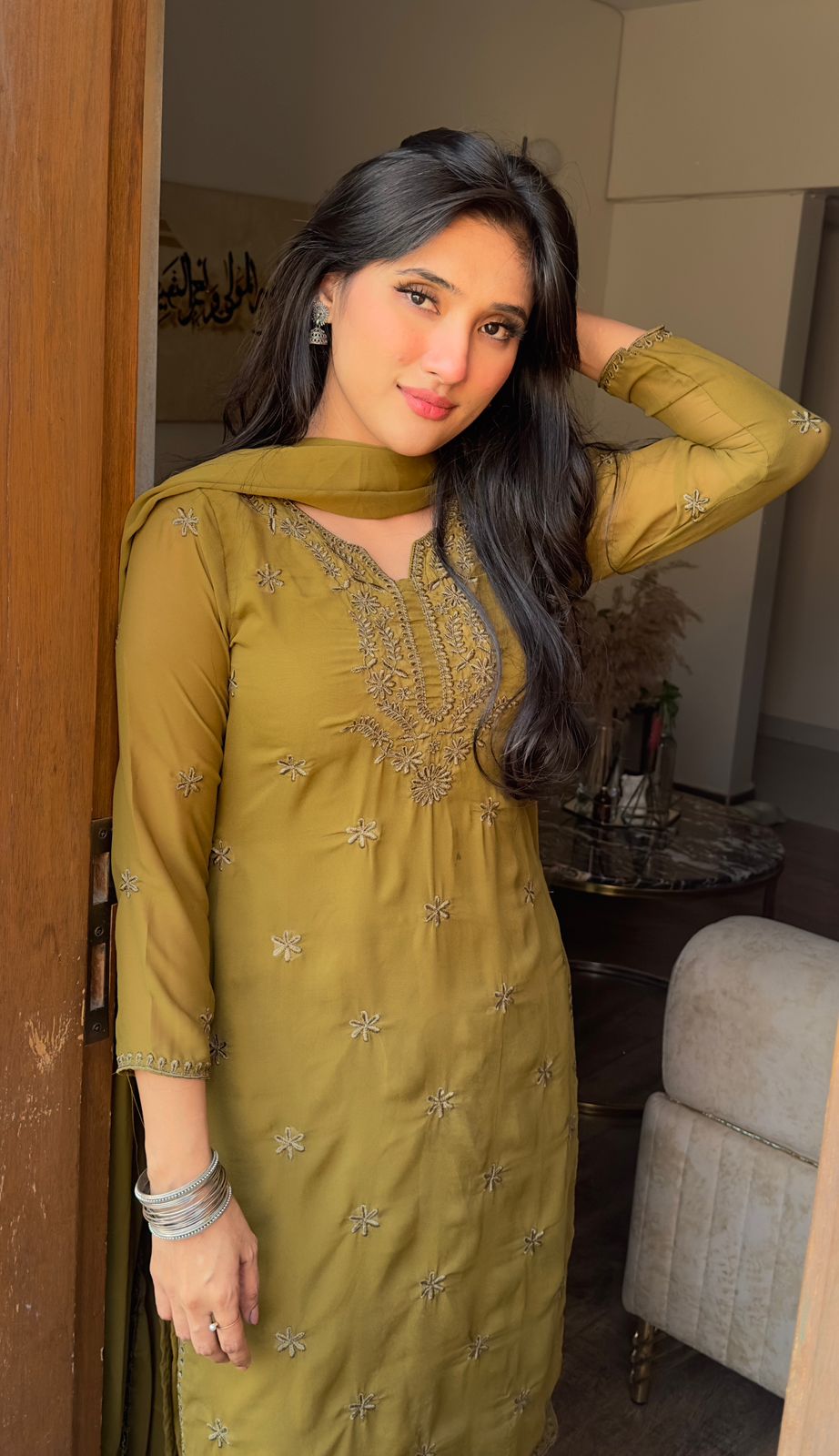 The Indian 3pc ๐‚๐ก๐ข๐Ÿ๐Ÿ๐จ๐ง ๐‹๐ฎ๐œ๐ค๐ง๐จ๐ฐ๐ข ๐ค๐ฎ๐ซ๐ญ๐ข Set is with Same Shade ๐‚๐ก๐ข๐ค๐š๐ง๐ค๐š๐ซ๐ข ๐ž๐ฆ๐›๐ซ๐จ๐ข๐๐ž๐ซ๐ฒ throughout the shirt, complemented by beautiful borders on Side Seams, Daman and sleeves.